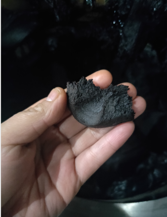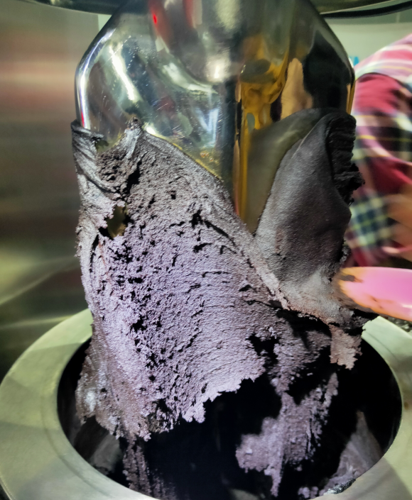 物料呈高粘度的膏體狀,第一代就是靠人工棒打,截至目前更新代換也是先用密煉機(jī)攪拌,攪拌之后在用壓面機(jī)來回碾壓。立式捏合機(jī)的捏合功能剛好代替兩種,經(jīng)過捏合實驗,客戶成型的產(chǎn)品效果相當(dāng)好。如此粘度之高的物料,擠壓出料干凈幾乎無殘留讓客戶甚是滿意,生產(chǎn)直接提高60%效率。